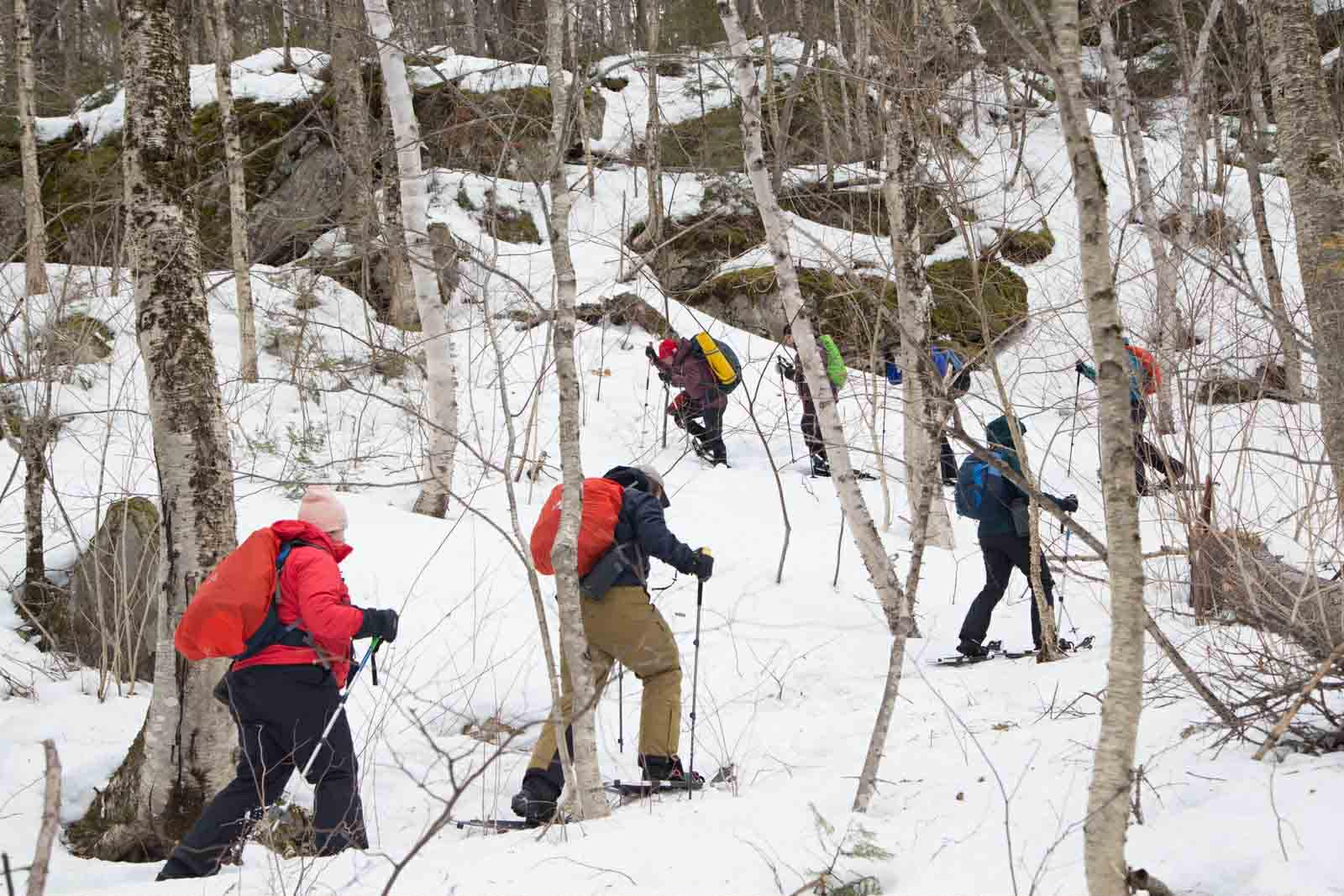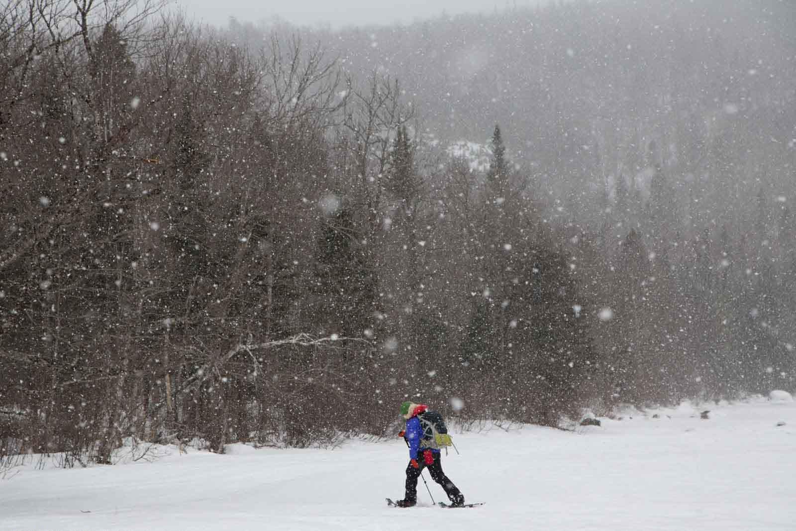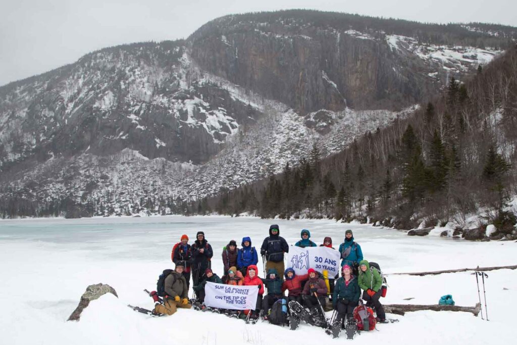 We arrive at Lake Cardinal in the early afternoon after crossing the frozen Portage River. Carefully, we follow one another in a disciplined line, planting the crampons of our snowshoes and our poles into the bluish ice. We climb one last hill and then, little by little, the azure lake appears, carved into its rocky cirque and surrounded by ice and stone. Before seeing the lake, we hear it, or rather we hear the exclamations of those who spot it first.