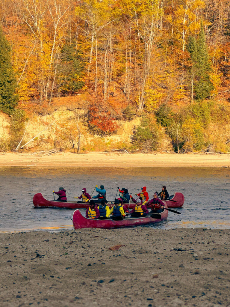 In a small sheltered corner of the reservoir, protected from the wind and waves, we took a collective moment in our rabaskas to fully absorb all this beauty… the colorful leaves, the sound of the waves, the blowing wind, the smell of pine, and the sun warming our skin! It reminded us that nature has this unique power to bring the present moment to the forefront. Despite the challenges and fatigue of this first day, the participants gave one last effort to climb the stairs leading to the camp, their chests already swelling with pride!