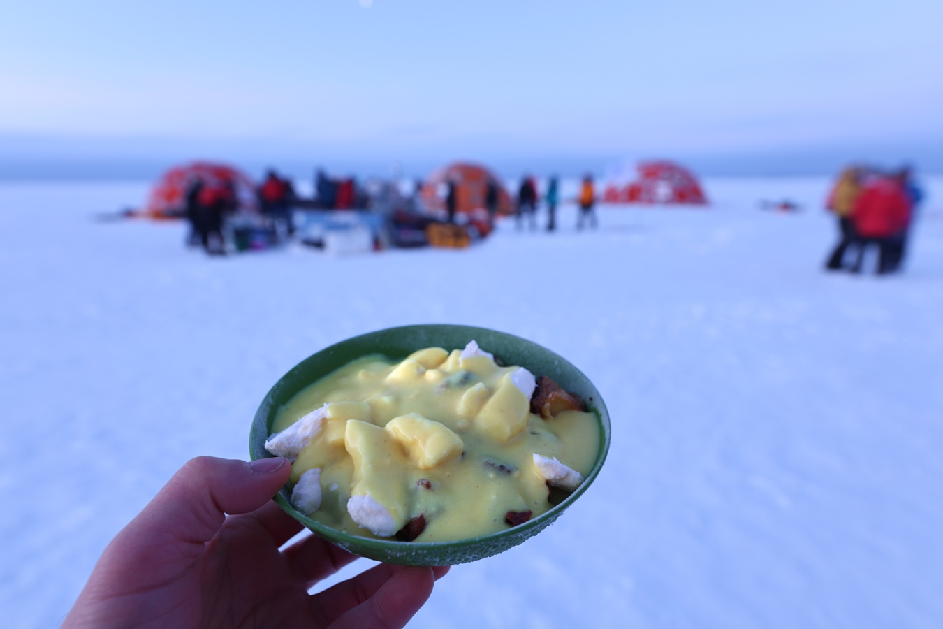 Let us return to dinnertime. Once again, our kitchen team amazed us. Steaming spinach soup supported by giant cheese curds, coconut milk curry over rice with, as an island, a naan bread drowned in its coconut milk broth. To crown it all… carrot cake topped with its richly buttered, luscious icing, even in this polar cold. Everyone bows before our valiant cooks. What they manage to create at lightning speed borders on the divine. They are funny, coordinated, calm, organized, and caring.