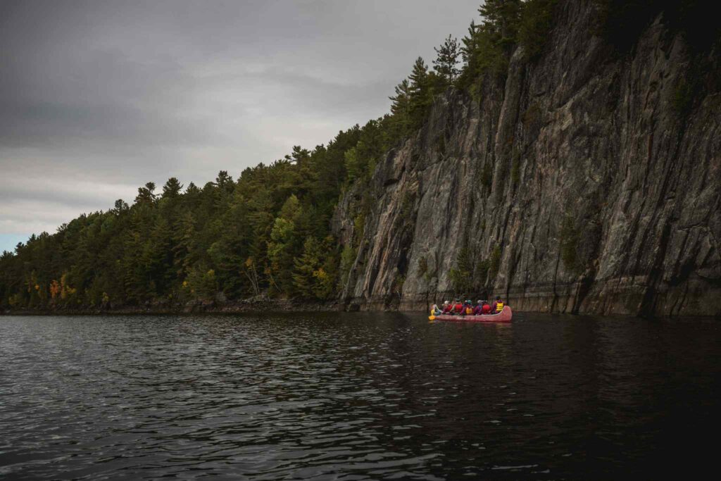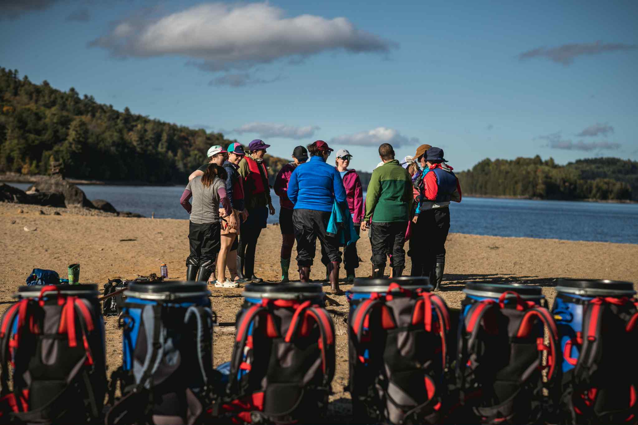The rain stopped, and we continued on our way to the site for the night. Isabelle decided to steer the rabaska; it was her first time, and she was talented. We stopped at Elephant Cliff. There, we decided to let go of what no longer served us. A collective cry as a sign of great release, followed by a silence full of meaning, understanding, and mutual support that can’t quite be explained. The sun came out again, and the water began to sparkle. The combination of colorful trees and shimmering water was perfect. We admired, we appreciated, and before we knew it, we had arrived. Shouts of joy, celebrations — we were proud of what we had accomplished together.