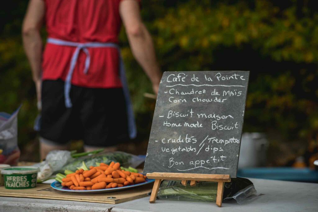 Time flies faster than we think. We arrived at our lunch site. The logistics team — Charles-Antoine, Éric, and Serge — welcomed us with big smiles, hot drinks, a well-pitched tarp, and their Café de la Pointe aprons. It felt like the comforting equivalent of an all-inclusive, wilderness-camping version. We felt spoiled.